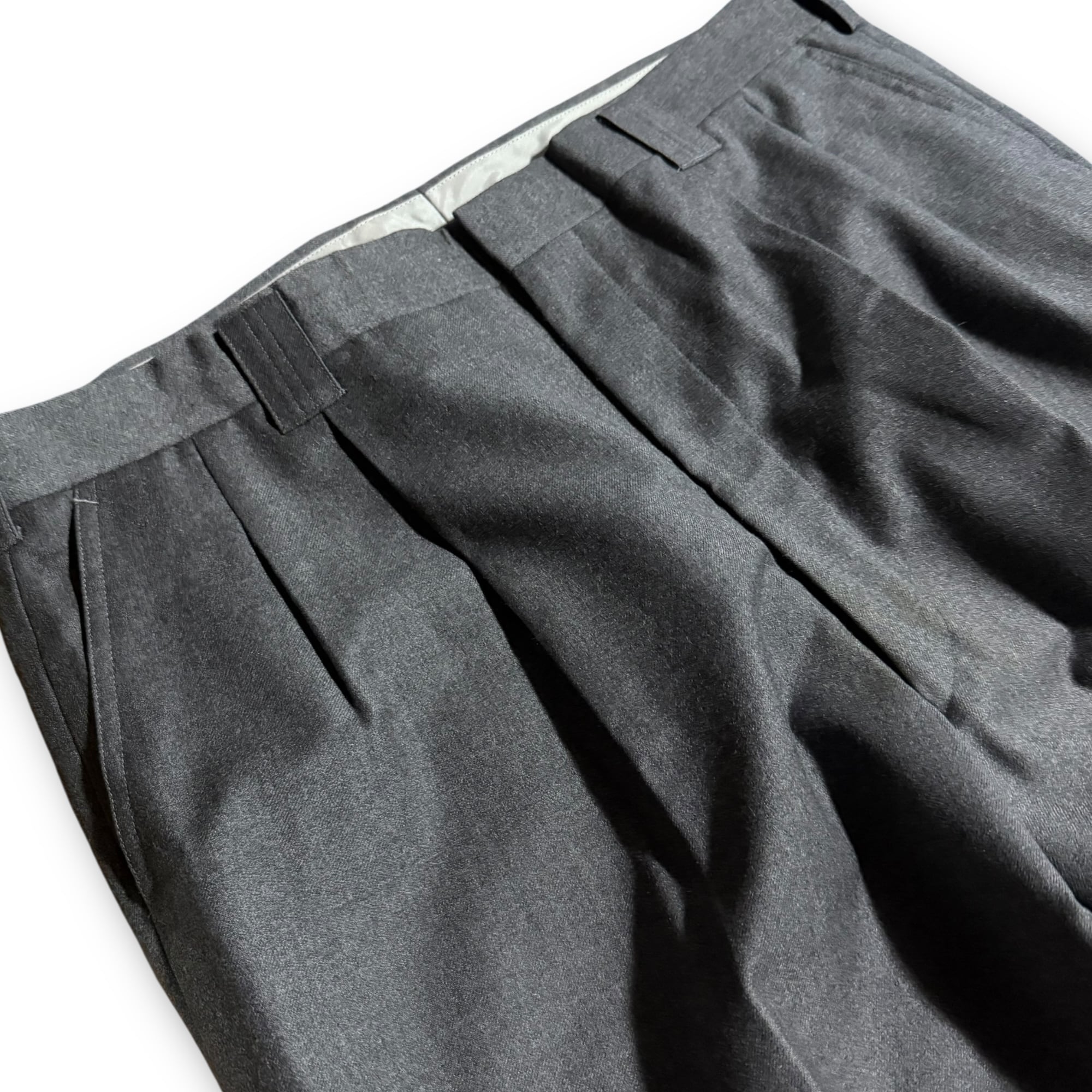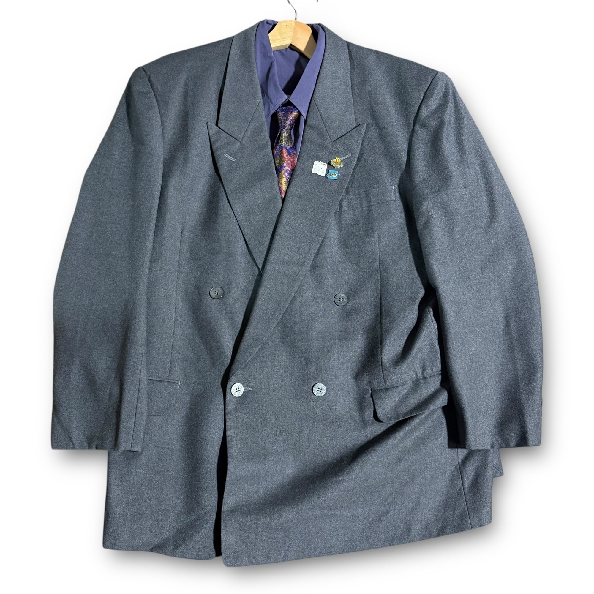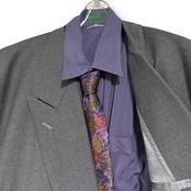 "VERZOLETTO" grey double set-up & "CARVEN" purple shirt & "RYKIEL" design tie & vintage pins / "ヴェルゾレット" グレーダブルセットアップ&"カルヴェン" パープルシャツ&"リキエル" デザインネクタイ&ビンテージピンズ