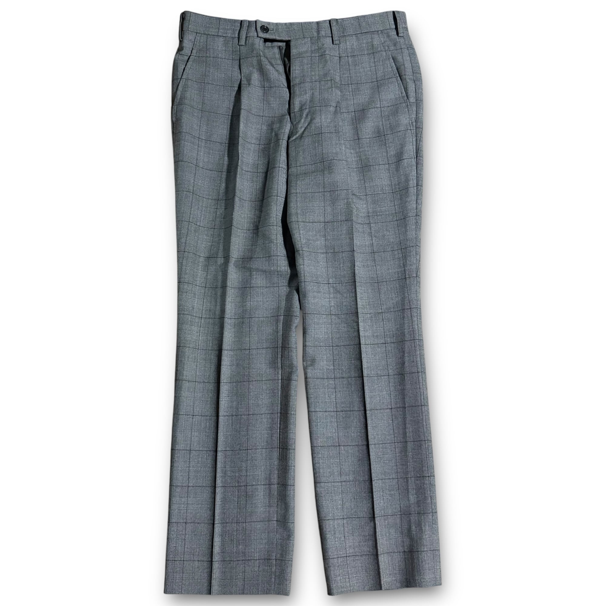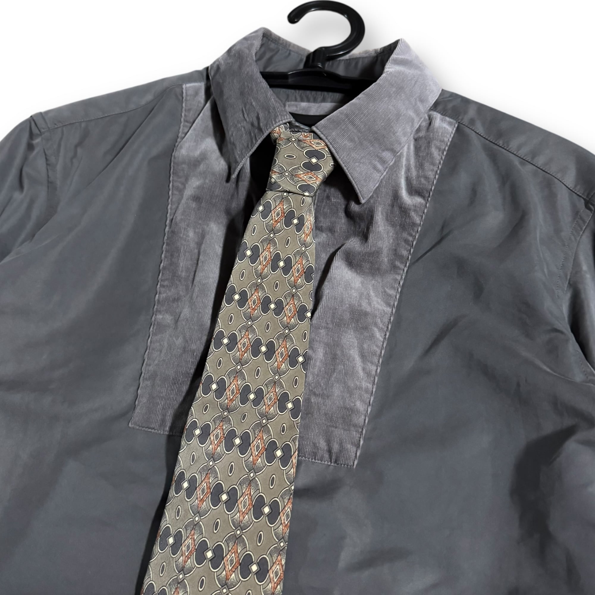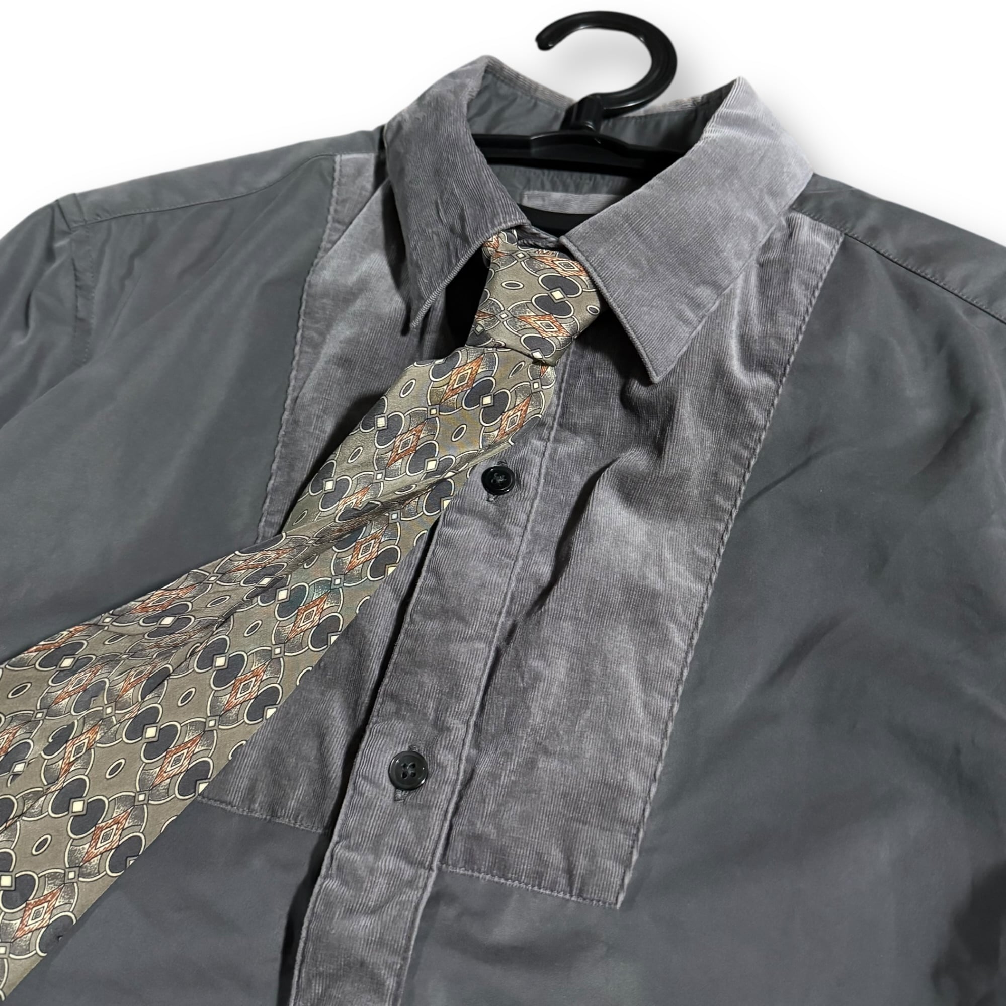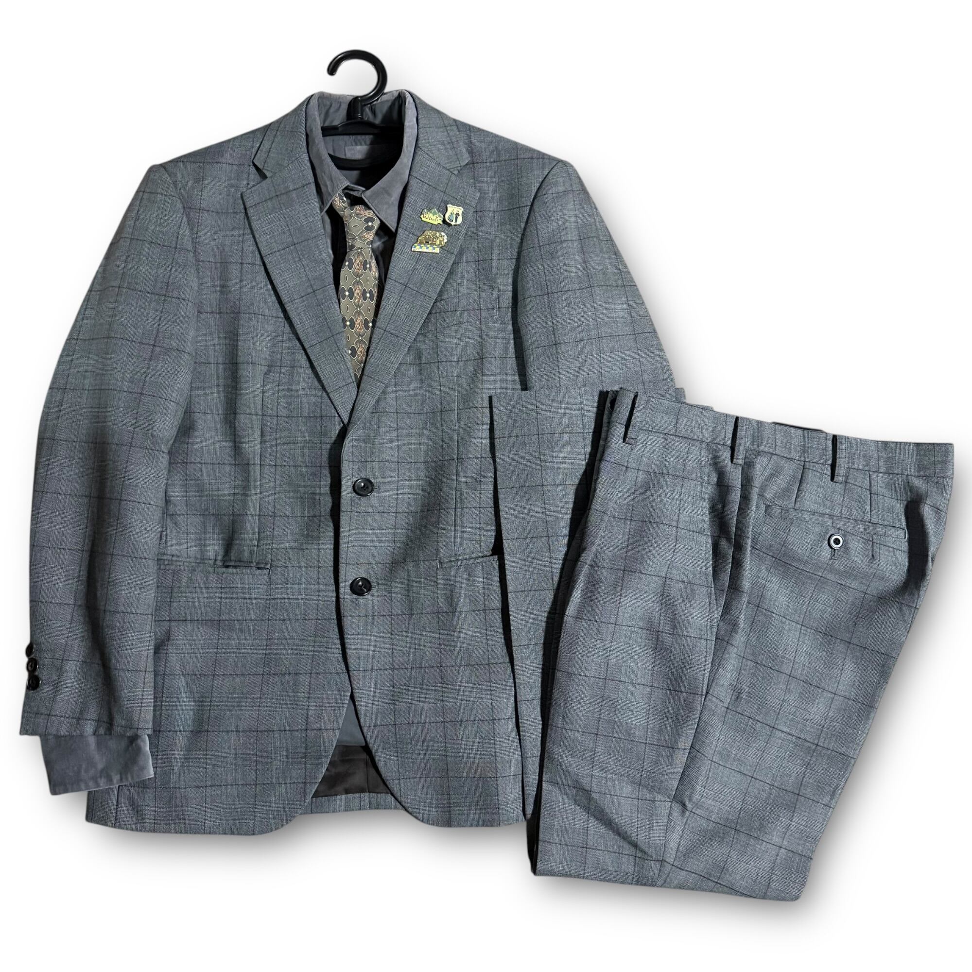 grey brown check set-up & grey corduroy shirt & "BALMAIN" tie & vintage pins / グレーブラウンチェックセットアップ&グレーコーデュロイシャツ&"バルマン" ネクタイ& ビンテージピンズ