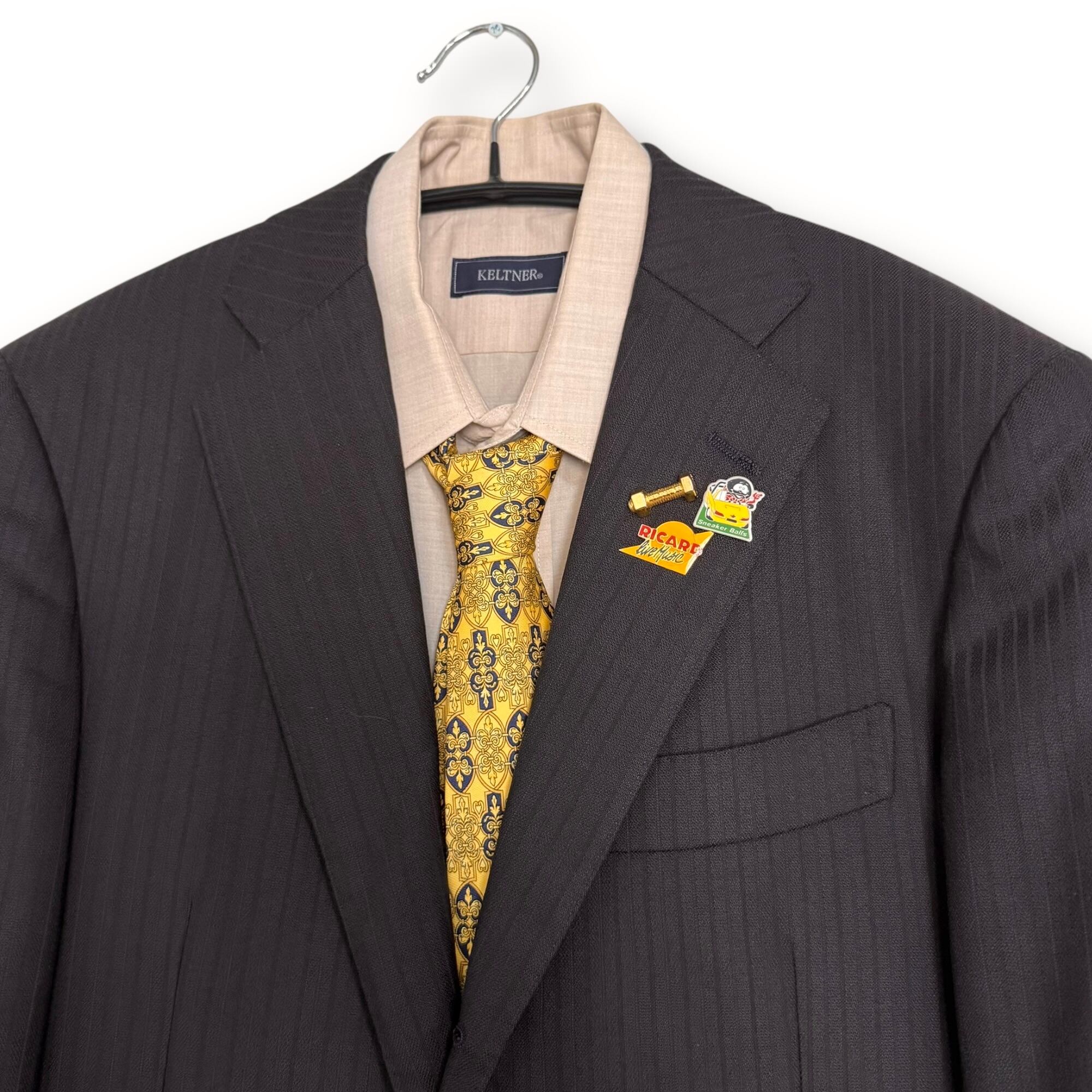brown stripe set-up & yellow beige shirt &"BALMAIN" tie & vintage pins / ブラウンストライプセットアップ&イエローベージュシャツ&"バルマン"ネクタイ&ビンテージピンズ