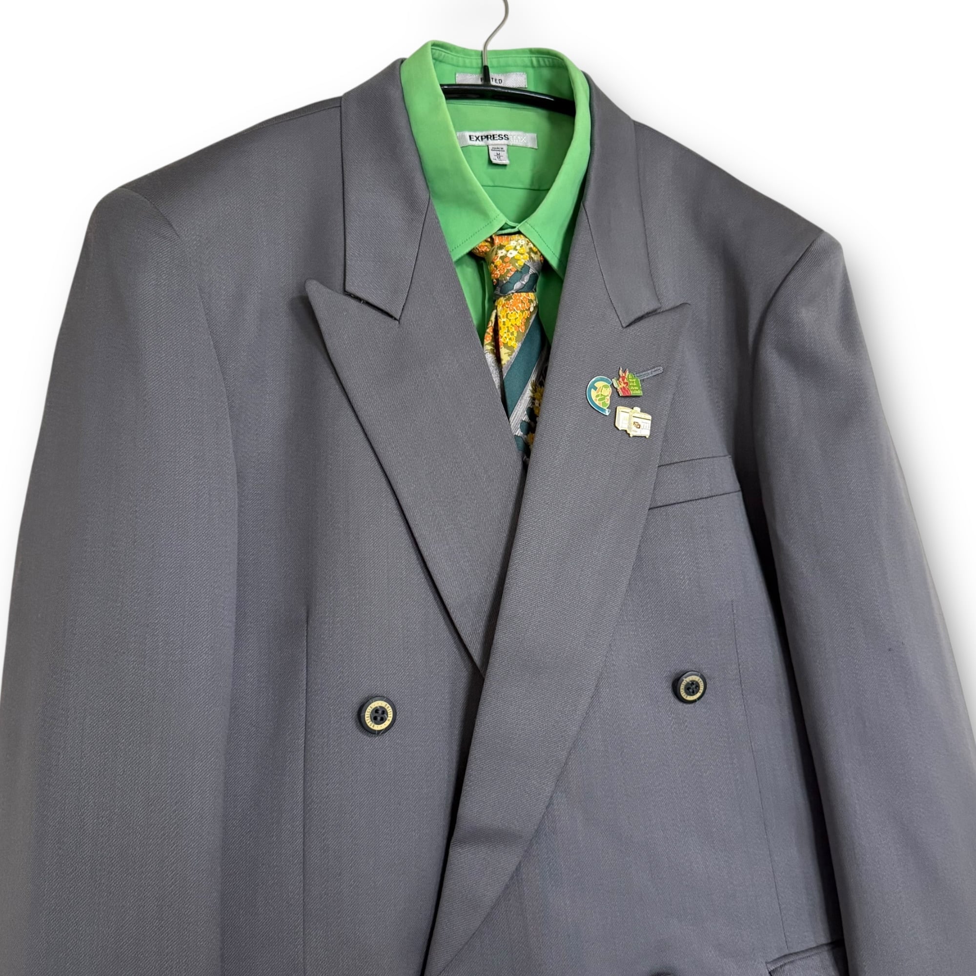 90's grey color wool set-up & green shirt & design tie & vintage pins / グレーカラーウールセットアップ&グリーンシャツ&デザインネクタイ&ビンテージピンズ