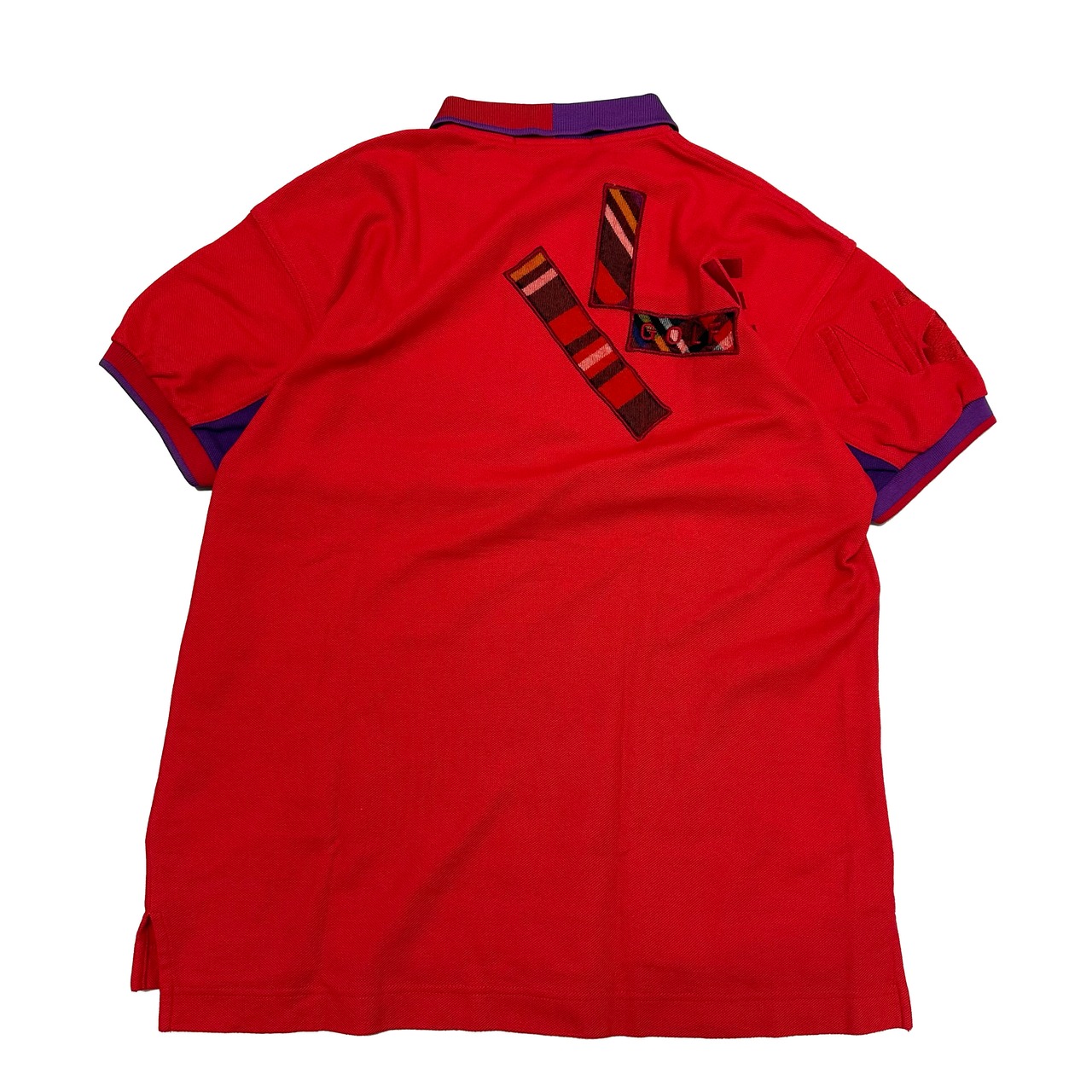 レッドベースのボディに、襟、脇袖部分にパープルの切り替えが面白いですよね。